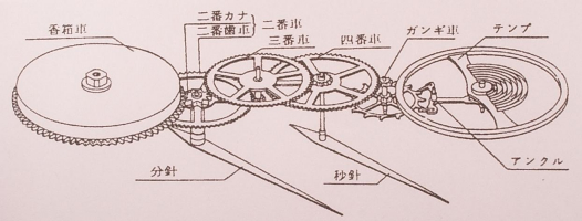 香箱の中にあるゼンマイが動力源です。巻かれたゼンマイがほどける力を利用して、回転運動から往復運動に変換し、歯車に伝え針を動かします。