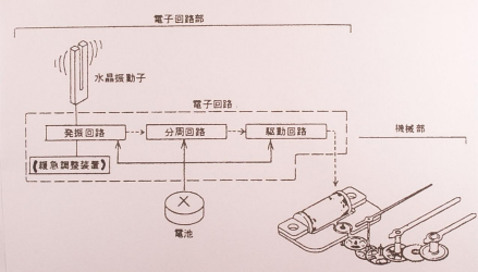 簡単に説明すると、水晶ユニットのなかの水晶は、内蔵された電池により電圧を加えられると振動し、この振動は集積回路でパルス信号になり、電流をコイルブロックに流し、コイルブロックは、電流が流れたため磁性を帯び、その磁力が伝えられ、もともと磁力を持ったローターを回転させ、歯車を伝わり針を動かします。